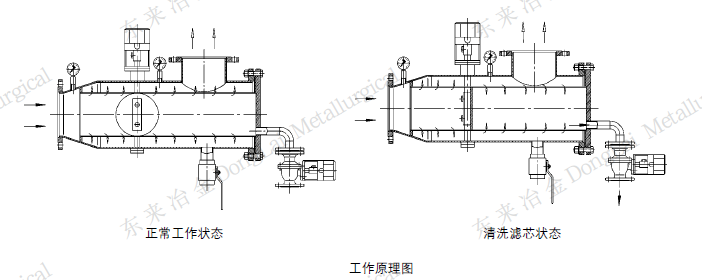 本過濾器主要由優(yōu)質(zhì)碳鋼或不銹鋼筒體、濾網(wǎng)、水流導(dǎo)向閥、差壓控制器、電動控制箱及排污裝置等所組成。當(dāng)過濾器工作時,水流導(dǎo)向閥處于開啟狀態(tài),水流由入口進(jìn)入過濾器,經(jīng)濾網(wǎng)過濾后流入出口。本機(jī)采用壓差控制、定時控制自動清洗濾網(wǎng)。當(dāng)過濾器進(jìn)出口壓差達(dá)設(shè)定值或定時器達(dá)到預(yù)置時間時,電動控制箱發(fā)出信號,排污閥打開(水流導(dǎo)向閥處于開啟狀態(tài)),水流沖洗粘在濾網(wǎng)壁上的雜質(zhì),雜質(zhì)由排污口排出。稍后水流導(dǎo)向閥開始關(guān)閉(排污閥處于開啟狀態(tài)),水流在導(dǎo)向閥關(guān)閉過程中流速不斷加大,粘附在濾網(wǎng)內(nèi)壁上的雜質(zhì)被進(jìn)一步?jīng)_洗排出,當(dāng)水流導(dǎo)向閥處于全關(guān)狀態(tài)下,水流被迫從過濾器進(jìn)口段網(wǎng)孔進(jìn)入濾網(wǎng)外側(cè),大部分凈液從出口流出,一部分凈液又從濾網(wǎng)外側(cè)進(jìn)入濾網(wǎng)內(nèi)部(因為系統(tǒng)處于泄壓狀態(tài),濾網(wǎng)內(nèi)部壓力小于外側(cè)壓力),從而對濾網(wǎng)進(jìn)行反沖洗,特殊設(shè)計的濾網(wǎng)使得在濾網(wǎng)內(nèi)部產(chǎn)生了噴射效果,任何雜質(zhì)都被從光滑的內(nèi)壁上沖走。當(dāng)過濾器進(jìn)出口壓差恢復(fù)正?;蚨〞r器設(shè)定時間結(jié)束后,電動排污閥關(guān)閉,水流導(dǎo)向閥開啟。整個過程中,物料不斷流,實現(xiàn)了連續(xù)化、自動化生產(chǎn)。